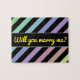 This puzzle design features a pattern of stripes coloured various light pastel colours, with black stripes in between them. It also features the marriage proposal "Will you marry me?" on the front in yellow script-like text. A puzzle like this could be a fun way to ask for somebody's hand in marriage.