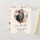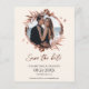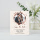 A simple and elegant wedding Save the Date card featuring chic floral wreath and rose gold foil design that is easy to personalise with your details. The card has a modern boho style, customisable calligraphy, handwritten font, and a wreath photo wedding invitation.
