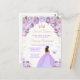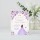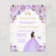 This elegant and glamourous sweet sixteen birthday invitation features a beautiful princess with dark skin in a light purple ball gown. The text combines handwritten script and modern sans serif fonts for a classy and sophisticated look. The floral arrangements, butterfly and gold confetti create the perfect blend of rustic and chic.