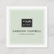Elegant, professional business cards or personal profile cards with your custom logo, name and title/company name printed on the front on a light sage green background with a white border around the edge of the card. On the back are customisable template fields for your name, title/company name/speciality and contact information. A minimal and classy design for any industry