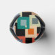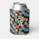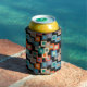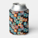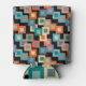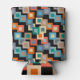 This can cooler has a geometric design of squares inside squares in lighter shades of blue, teal, orange, tan, off-white, mango, and grey on a field of black.
