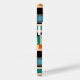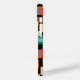 This phone case has a geometric design of squares inside squares in lighter shades of blue, teal, orange, tan, off-white, mango, and grey on a field of black.