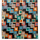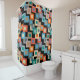 This shower curtain has a geometric design of squares inside squares in lighter shades of blue, teal, orange, tan, off-white, mango, and grey on a field of black.