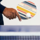 This is a customisable ping pong paddle design made of beige, blue, red, and yellow stripes.