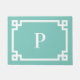 Decorative white Greek Key style geometric rectangular border on a light teal 18" x 24" door mat with a modern serif monogram.