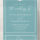 This light teal blue coastal themed wedding invitation with tearaway RSVP has a simple minimalist design with two a scallop shell at the top, a frame around the edge, and elegant script text. Please see the collection for the matching wedding invitation suite and more matching products.