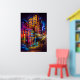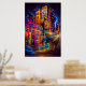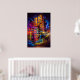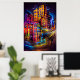 An abstract painting of buildings in vividly neon light and light trail of vehicles passing by.