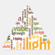 This artwork centres on the word "light" rendered in large, bold letters. Surrounding this focal point are numerous related words, arranged in varying sizes and orientations, filling the frame and creating a dense, visually interesting composition. The arrangement of words forms a lively word cloud, emphasizing the central theme of light.