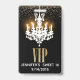 Chic Sweet 16 or Quinceañera party accessory badge done in black with graphics of a white chandelier that looks lit up, and gold looking glitter across the top. Graphics text in golden glitter reads VIP. White text, on the bottom, is ready to personalise for your daughter's big day.