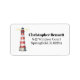 This design features a classic lighthouse with red and white horizontal stripes standing on the left side. A faint yellow light glows from the top lantern against a crisp white background. The right side provides a clean space for a name and address, displayed in a simple black font that is very easy to read. The overall look is balanced and uses traditional seaside imagery to create a bright, coastal theme. It is a straightforward design that works well for sending any kind of mail.
