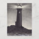 Lighthouse at night shining a navigation light Black and white illustration of a lighthouse shining it's navigation light beam in a dark night for the safety of a boat passing in stormy seas near the rocky ocean shore coastline. Copyright 1996 by Lee Serenethos with James Monahan.
