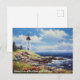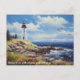 This postcard features a stunning view of a lighthouse on a beach, with a seagull flying overhead. The lighthouse is tall and imposing, with a red and white striped exterior.