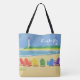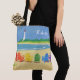 Stay in a beachy state of mind all the time with this personalised tote bag, featuring a lighthouse and beach chairs ready for a gathering. Personalise with any name. Great as a beach bag!