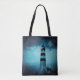 Nautical and maritime theme, a summery tote bag! A lighthouse a stormy dark blue night with clouds and rain. A light can be seen in the lighthouse tower. A dark blue image.