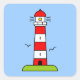 Lighthouse drawing stickers. Cute cartoon image of red and white light house tower with sea birds. Coastal scene envelope sealer design idea for nautical baby shower. Maritime logo icon.