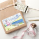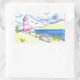 Lighthouse and cottage on shore front. Moody sky, topaz waters. A whimsical watercolour painting inspired by Happisburgh, Norfolk
