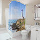 Lighthouse on hill blue sky white house ocean shower curtain