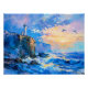 An impressionist painting of a lighthouse on a rocky coastline at sunset. The dramatic sky, crashing waves, and golden light create a vibrant seascape full of movement and atmosphere.