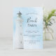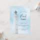 An invitation for a nautical coastal by the sea summer party, beach party. A light blue sky as background and a white lighthouse as decoration. Templates for your party details, information.