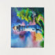 Tapestry in a watercolor style portrait of a lighthouse standing tall under a vibrant, star-filled night sky. Surrounded by lush green trees and soft grassy hills, its golden light glows warmly, creating an atmosphere that evokes wonder and tranquillity.