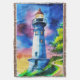 Throw in a watercolor style portrait of a lighthouse standing tall under a vibrant, star-filled night sky. Surrounded by lush green trees and soft grassy hills, its golden light glows warmly, creating an atmosphere that evokes wonder and tranquillity.