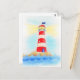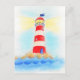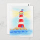 Painted whimsical nautical shining lighthouse beacon on the rocks with character sea waves postcard. Reproduced from an original watercolour painting by Sarah Trett.