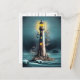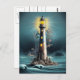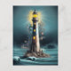 A lone lighthouse beams light on a rocky outcrop as waves lap at its base, creating a serene nighttime vista.