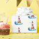 Watercolor red and white striped lighthouse with blue ocean water on white background.