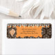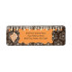 Holiday return address labels with a dark brown background with white snowflakes, a string of orange and melon lights, an ornament, and an orange frame where you can easily add your name and address before ordering.