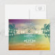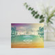 Gorgeous beach save the date postcards with modern script typography, seashell, starfish calligraphy and string of lights design. Nice sunset in the sea colours with ombre / gradient teal, purple, blue and yellow / orange. Perfect beach wedding save the date for destination wedding, beach wedding or coast wedding.
