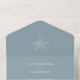 This wedding design is a perfect blend of elegance and beachy vibes. The main feature of the design is a small white starfish motif that sits gracefully in the centre of the dusty blue coloured background. The starfish motif is intricately designed and adds a touch of nature to the invitation. The typography used is classic white, which adds a touch of sophistication and ensures that the text is easy to read. The font style used is clean and modern, creating a timeless look that will never go out of fashion.
