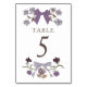Boho and rustic wedding table number featuring hand drawn illustration of ribbons with flowers in lilac colour.