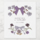 Rustic and romantic bow theme wedding wine bottle label featuring hand drawn illustration of lilac ribbons and flowers.