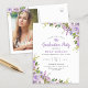Affordable custom printed graduation party postcard invitations. This pretty feminine design has a watercolor floral border with pastel purple flowers and greenery. Personalise the template with your grad party details. Reverse side has space for a photo with your printed return address for easy mailing. Click Customise It to choose any background colour and edit the text fonts and colours to create unique one of a kind graduation photo announcement and invite.