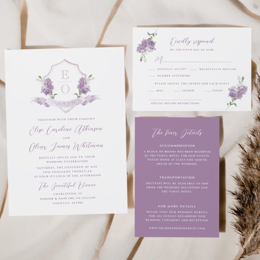 Lilac Floral Monogram Crest Wedding SuiteDesigned by MOONDAISY STUDIO