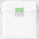 A square sticker with lilac flowers and a green tag. Customise the sticker with your special name, background colour, among other options.