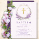 Beautiful Baptism invitations featuring a lavender lilac wreath and cross set on a light purple background. Flip our invitation over to view a coordinating back for an extra special touch.