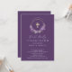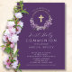 Beautiful First Communion invitations featuring a lavender lilac wreath and cross set on a dark purple background. Flip our invitation over to view a coordinating back for an extra special touch.