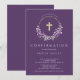 Beautiful First Confirmation invitations featuring a lavender lilac wreath and cross set on a dark purple background. Flip our invitation over to view a coordinating back for an extra special touch.