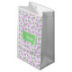 A gift bag built with a lilac flower pattern. Customise it with your own text, background colour, among other options.