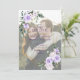 Modern and trendy, this pretty wedding Save the Date card design features is designed to mimic the very trendy vellum look, and features gold geometric embellished with lilac lavender purple florals, dusty blue green watercolor greenery, and features trend hand lettering, with your photo behind the text. (Note: the vellum overlay look is not actually a separate piece of translucent paper, it is all the one piece invitation.) Part of a matching wedding suite. Copyright Elegant Invites, all rights reserved.