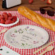 Wildflower customisable round paper plates. Magnolia and lilac floral accents. Easily customise the wordings