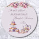 Personalise this elegant and whimsical Tea Bridal Shower thank you sticker featuring a soft, dusty lilac background adorned with delicate blush pink and lilac flowers. In the centre, is a charming teapot, cake stand beautifully displayed with an assortment of delicious tea cakes, complemented by a tea cup and saucer decorated with delicate floral patterns. The words "Bridal Shower Tea" are gracefully incorporated into the design, creating a perfect touch of sophistication and gratitude for your guests. Ideal for adding a special touch to your Tea Party Bridal Shower favours, this sticker is a lovely way to say thank you for celebrating with you.