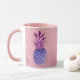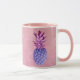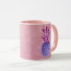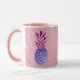 Colourful lilac pineapple with amaranth pink leaves on a pink glittering background.
