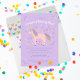 When she wants a unicorn themed birthday party, you give her a unicorn theme celebration. This light purple darling illustrated birthday party invitation features a textural, illustrated blush pink unicorn with pretty pastel rainbow mane and tail hair surrounded by a scatter of hearts and magic sparkles. The text of this child's invitation is easy to personalise including the arched script text for her name and age. The matching backer has a pattern of hearts to match.