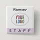 Easily personalise our square pin back button name badge with your company logo, staff name, or other custom text. It attaches with a safety pin back. Sold in light purple and other colours (all colours are customisable). Our square buttons are 2 inch x 2 inch. Made in USA. No minimum order quantity and no setup fee.