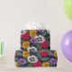 This is a colourful watercolor pattern of multicolored lilac, red, white and yellow poppy flowers with green leaves on a navy blue background.