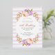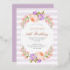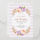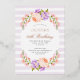 Affordable custom printed 30th birthday brunch invitations personalised with your event details. This pretty botanical design features a watercolor frame of peach and lavender flowers on a pastel purple striped background. Use the design tools to customise the text, edit the fonts and colours or add your own photos to create an elegant spring floral birthday party invitation.