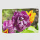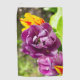 Bright lilac tulips on a sunny day in the garden. The photo was taken in June 2022. The poster is suitable for interior design.