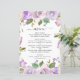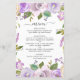 Purple floral wedding menu with a border of watercolor painted flowers in shades of pastel violet, lavender, lilac and ivory. The header "menu" is in an elegant script with swashes. These cheap wedding menus are printed on sheets of paper for a budget friendly option and are perfect for a spring or summer wedding.